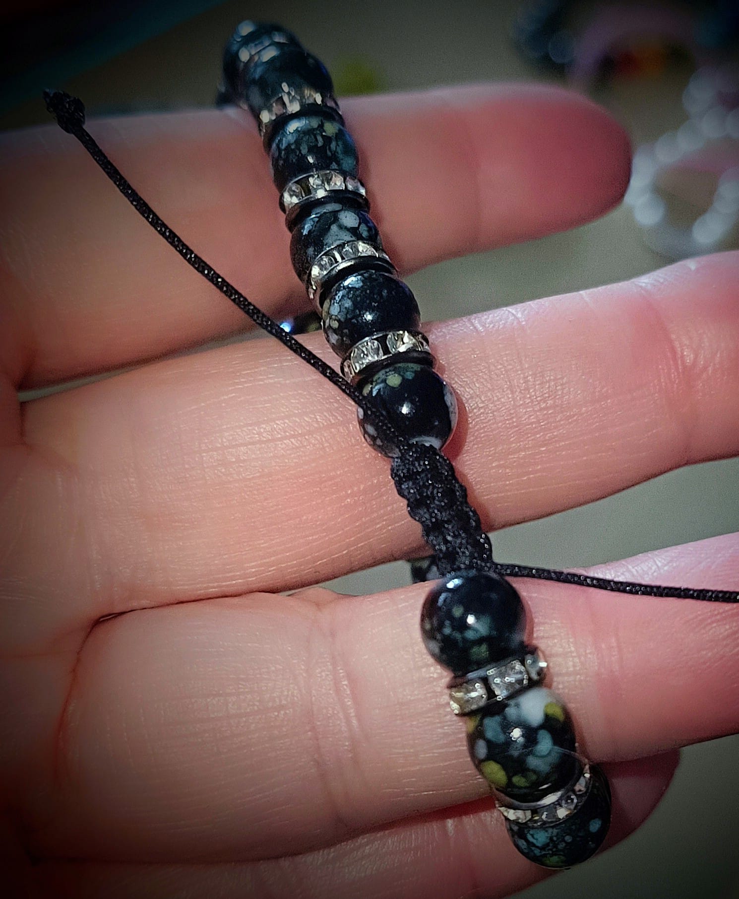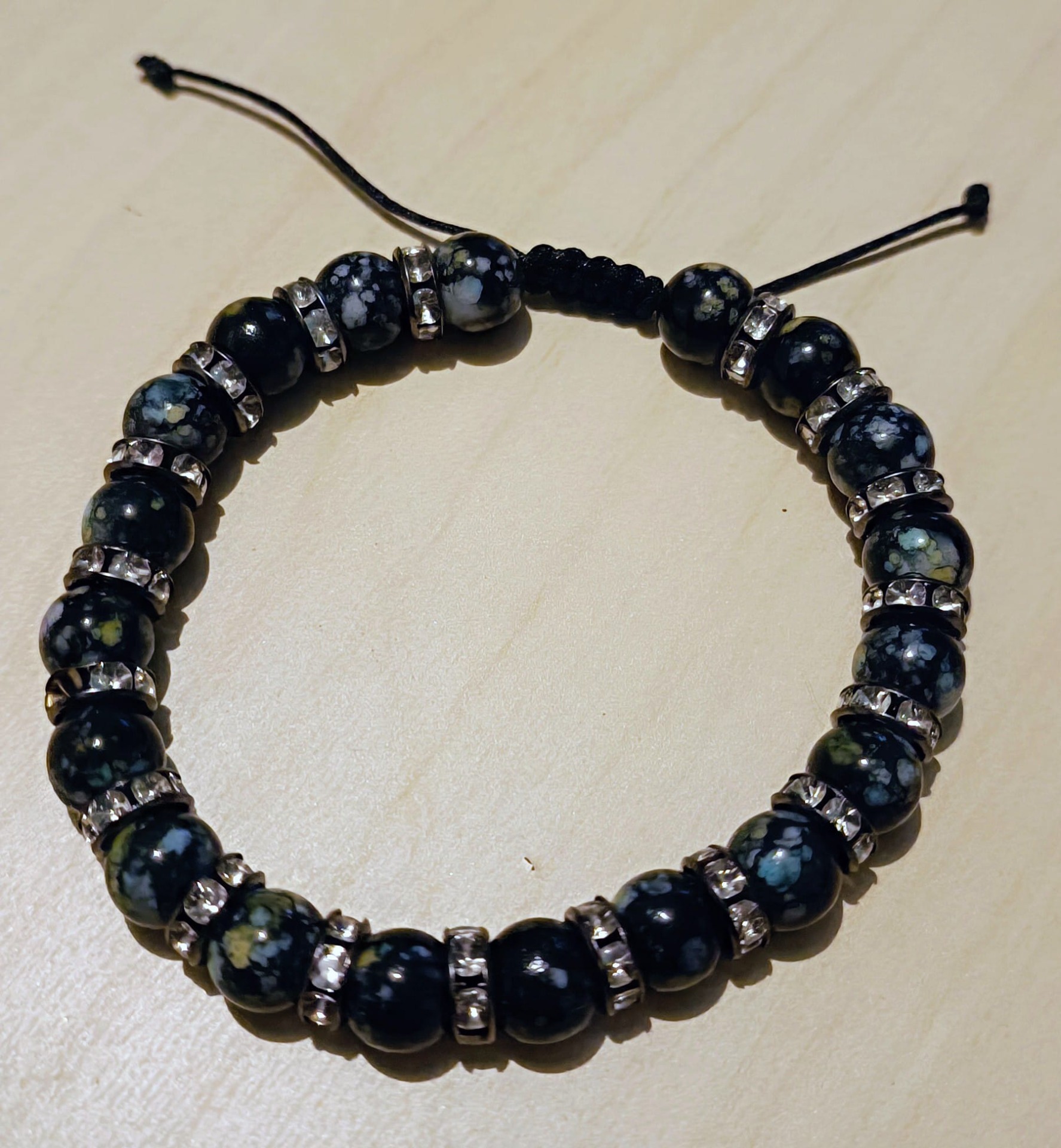 Stylový náramek z tmavých korálků s jemnými detaily , doplněný rondelkami .