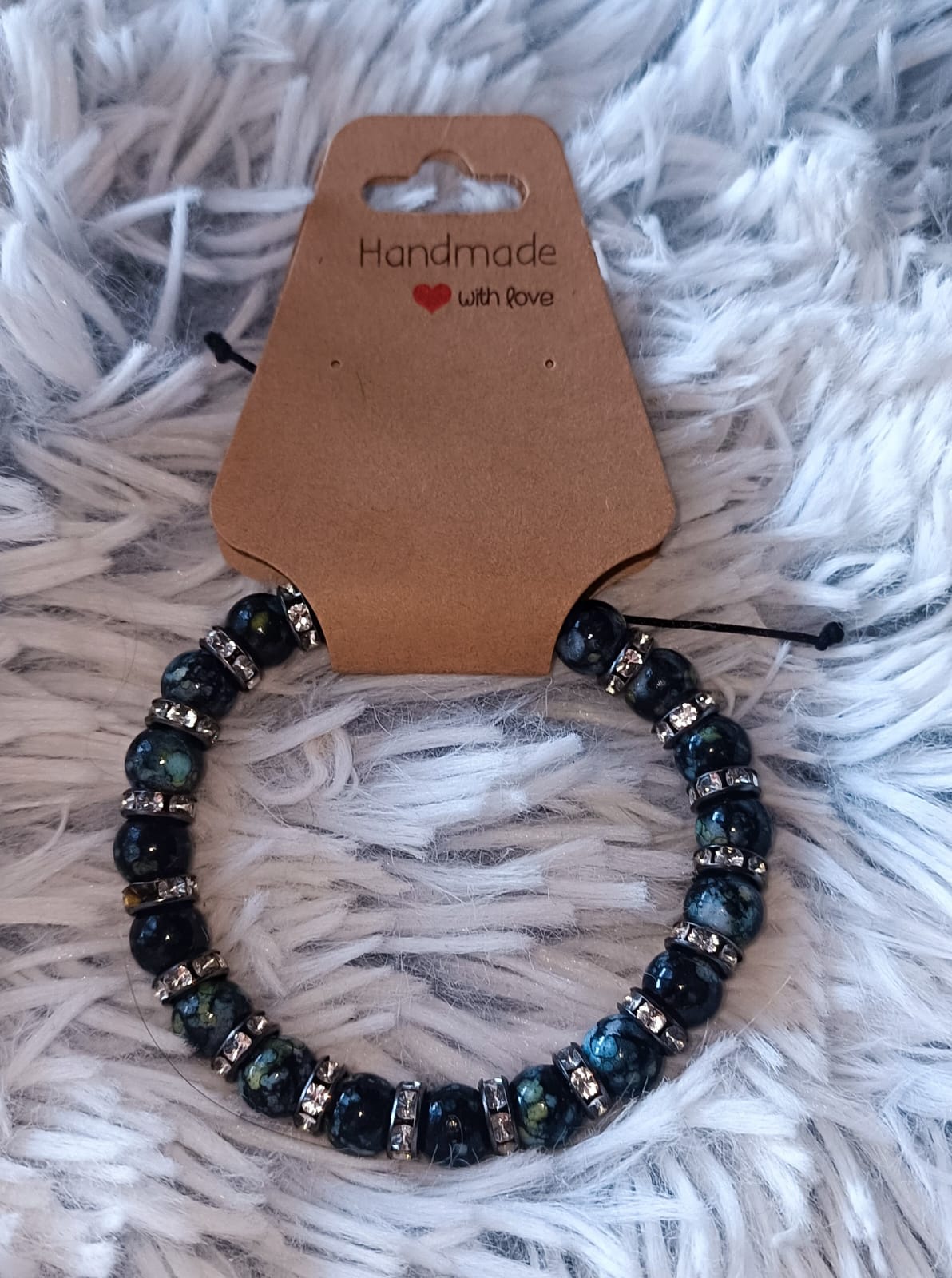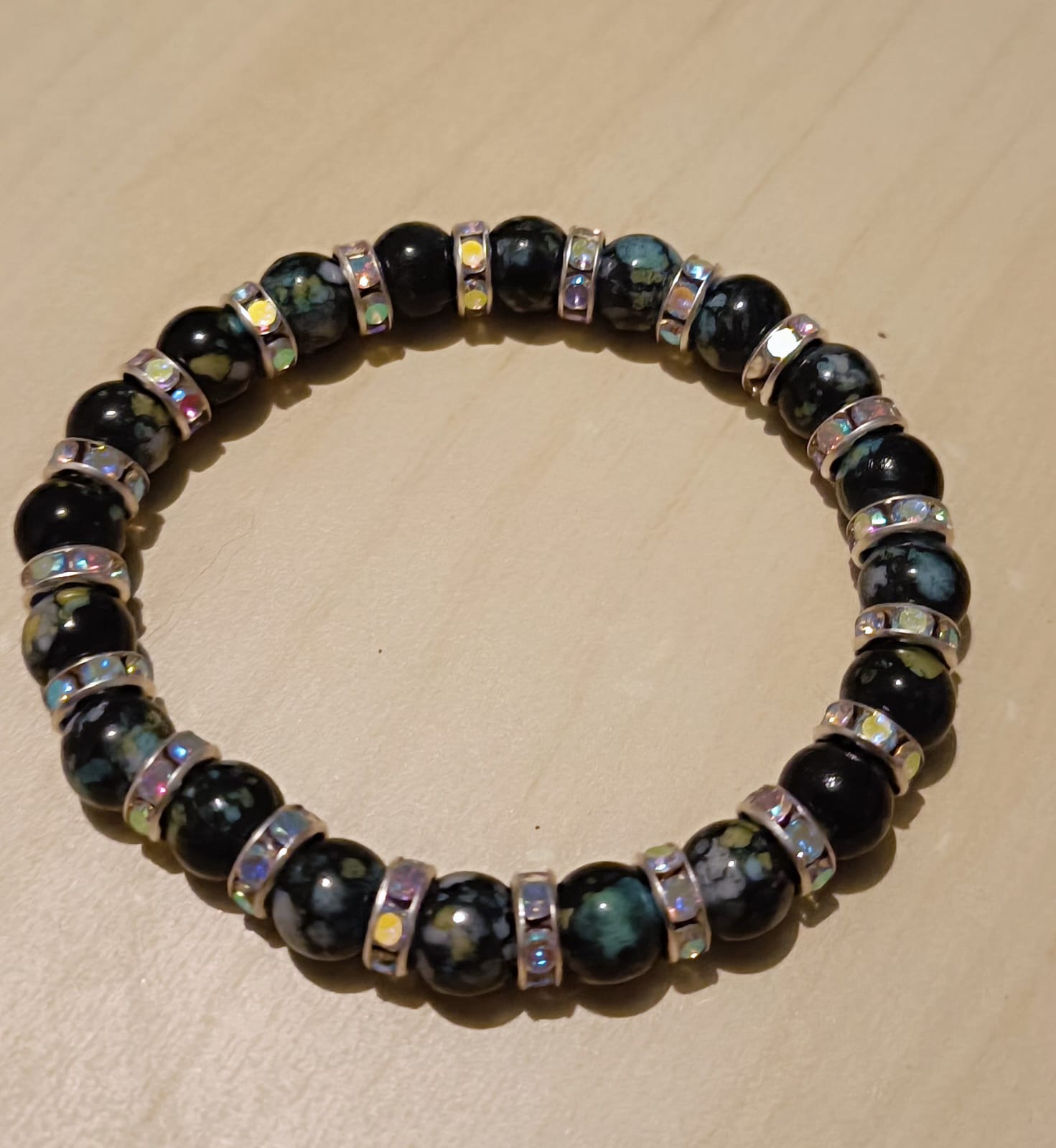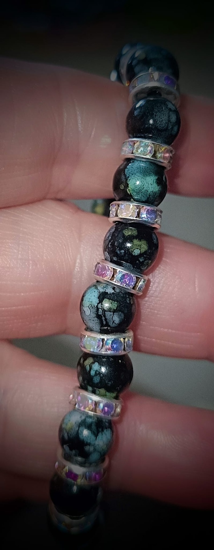 Stylový náramek z tmavých korálků s jemnými detaily , doplněný rondelkami .