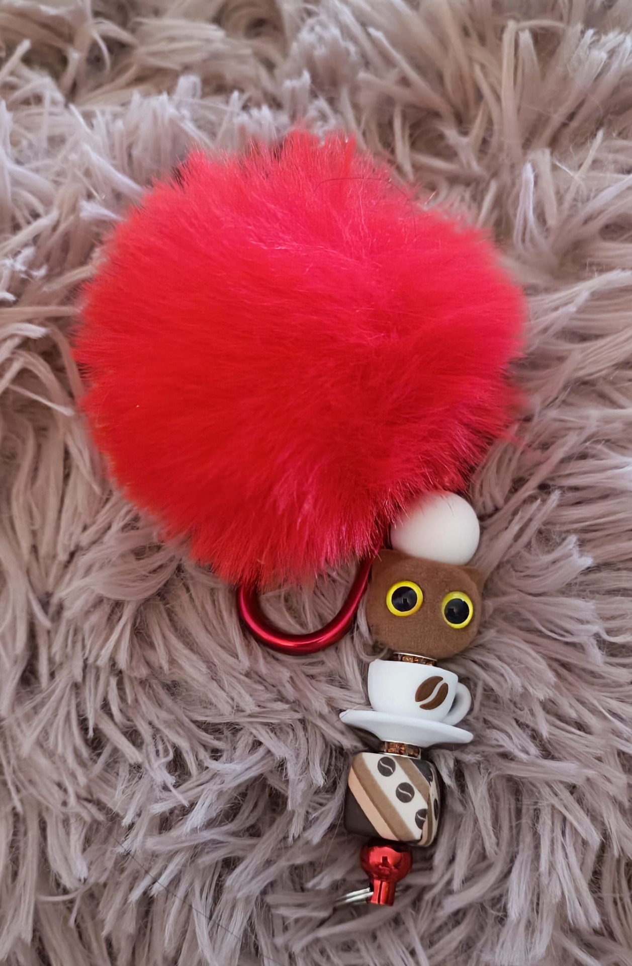 Originální přívěsek s hebkou červenou bambulkou a kávovými korálky .