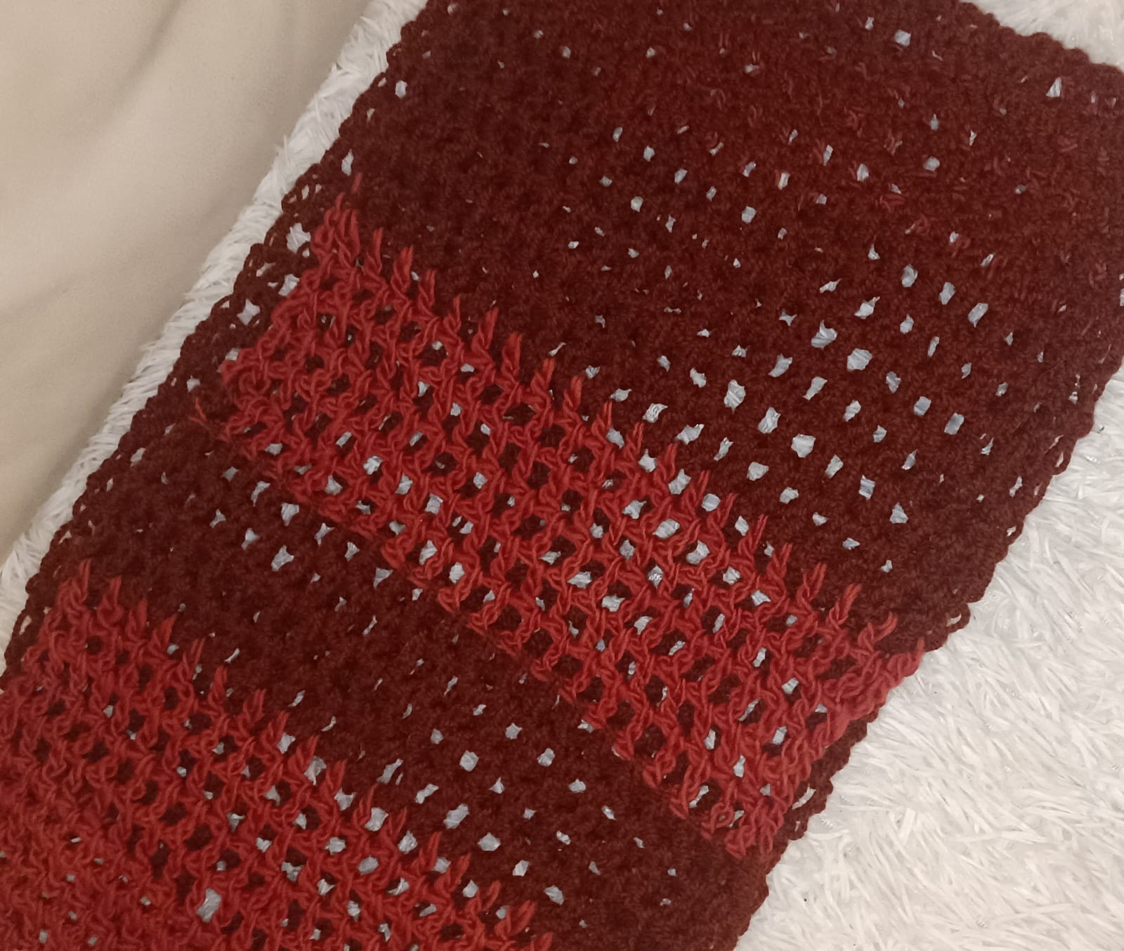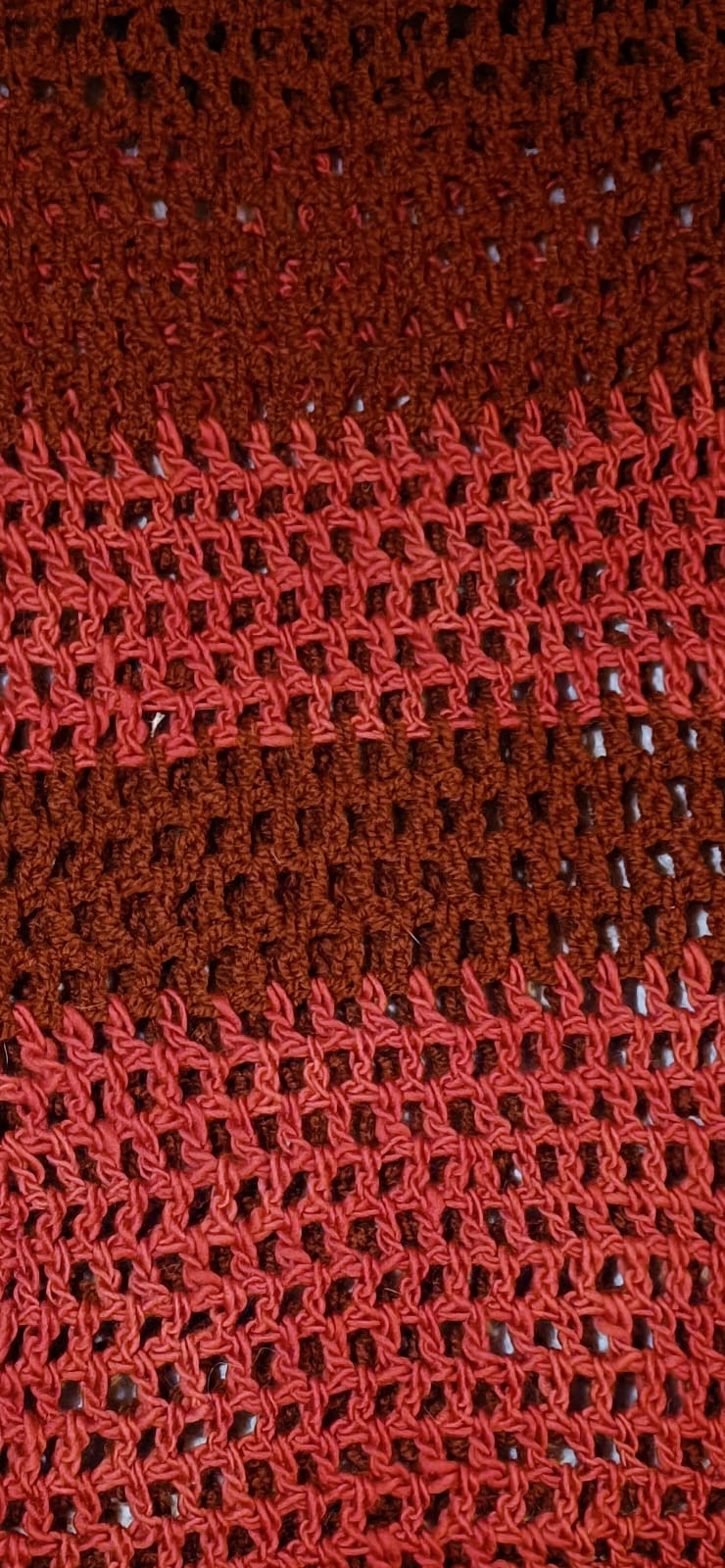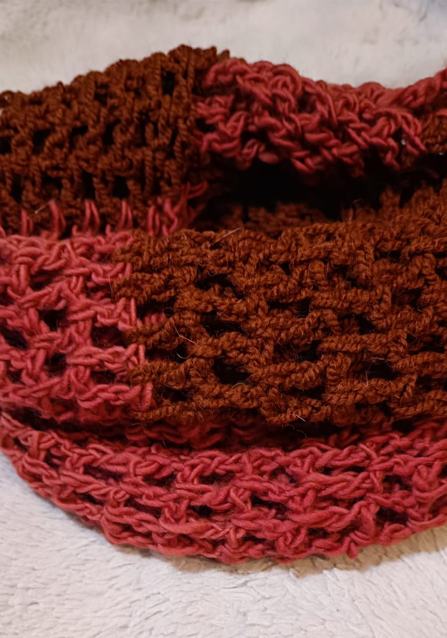 Ručně háčkovaný dvoubarevný kruhový šál v kombinaci teplé hnědé a cihlové .