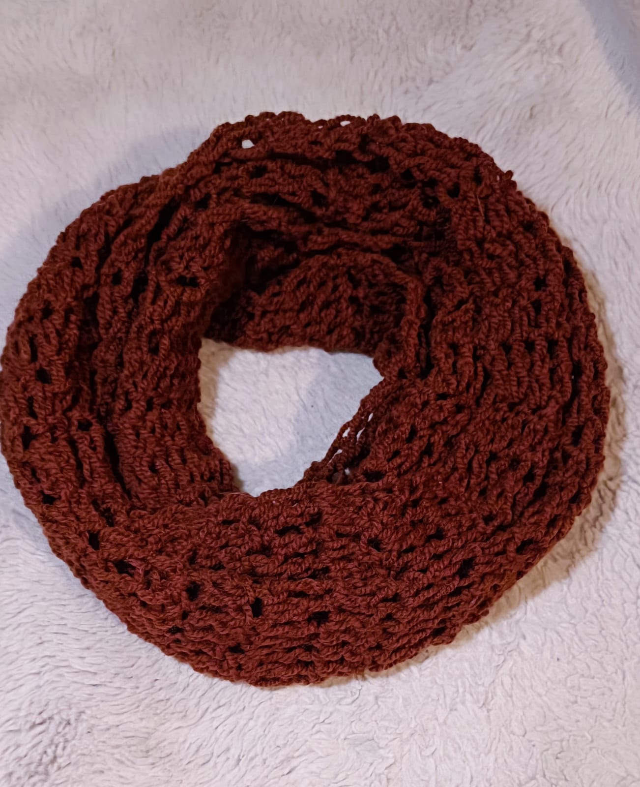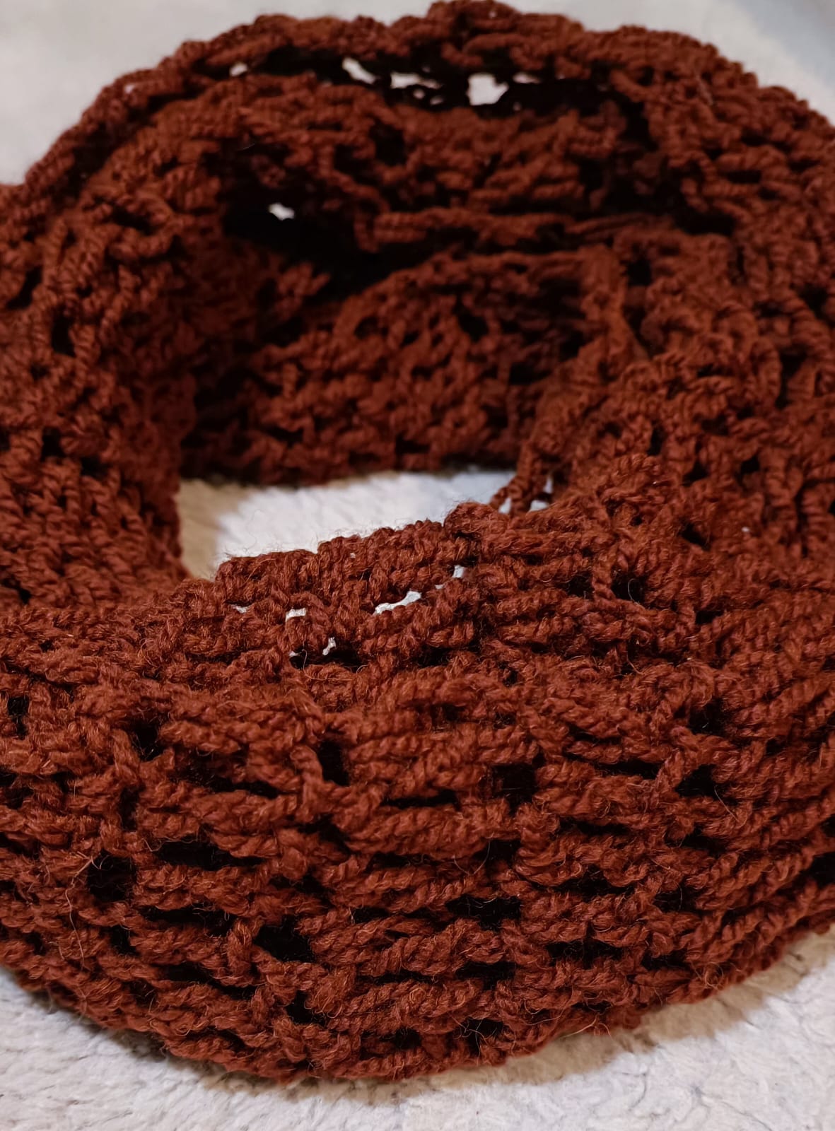 Šál je uháčkovaný v teplé karamelově hnědé barvě . je lehounký , hřejivý a příjemný na nošení .