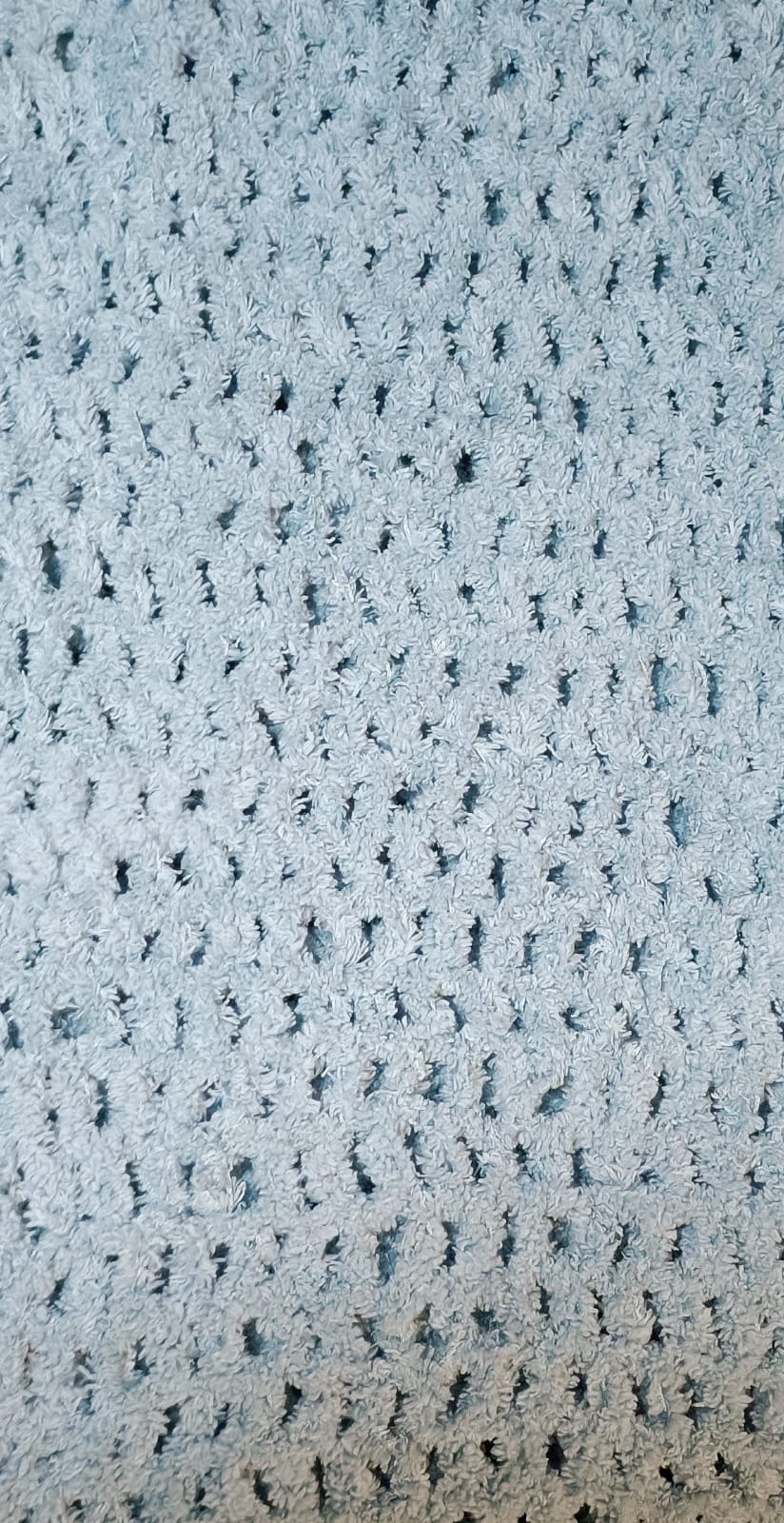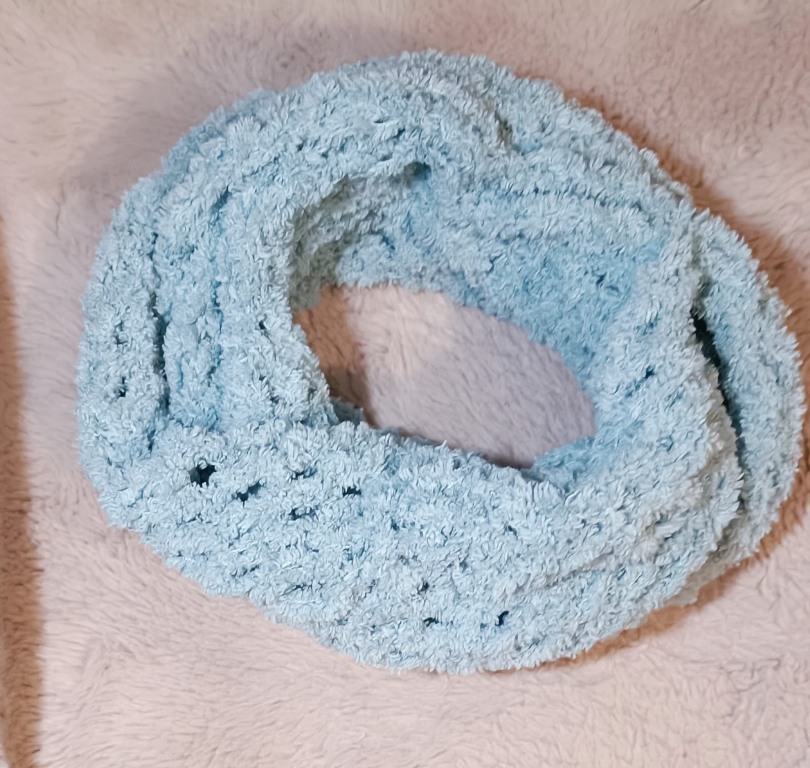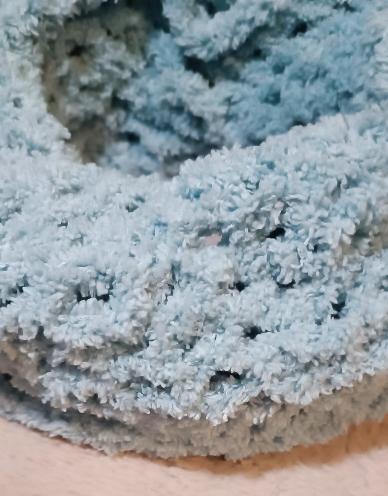 Extra měkký a heboučký šál ručně dělaný z chlupaté příze ve světle modré barvě .