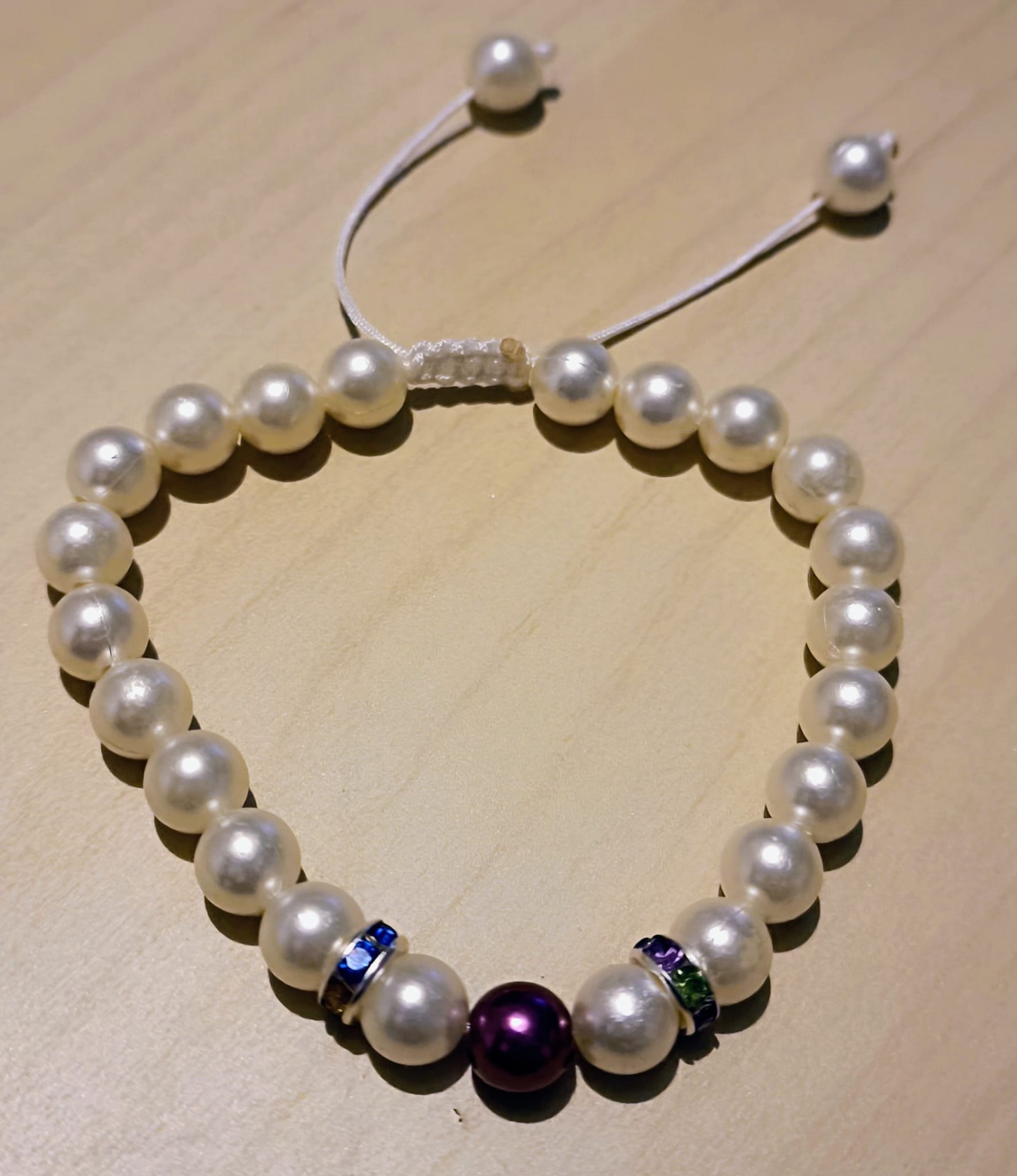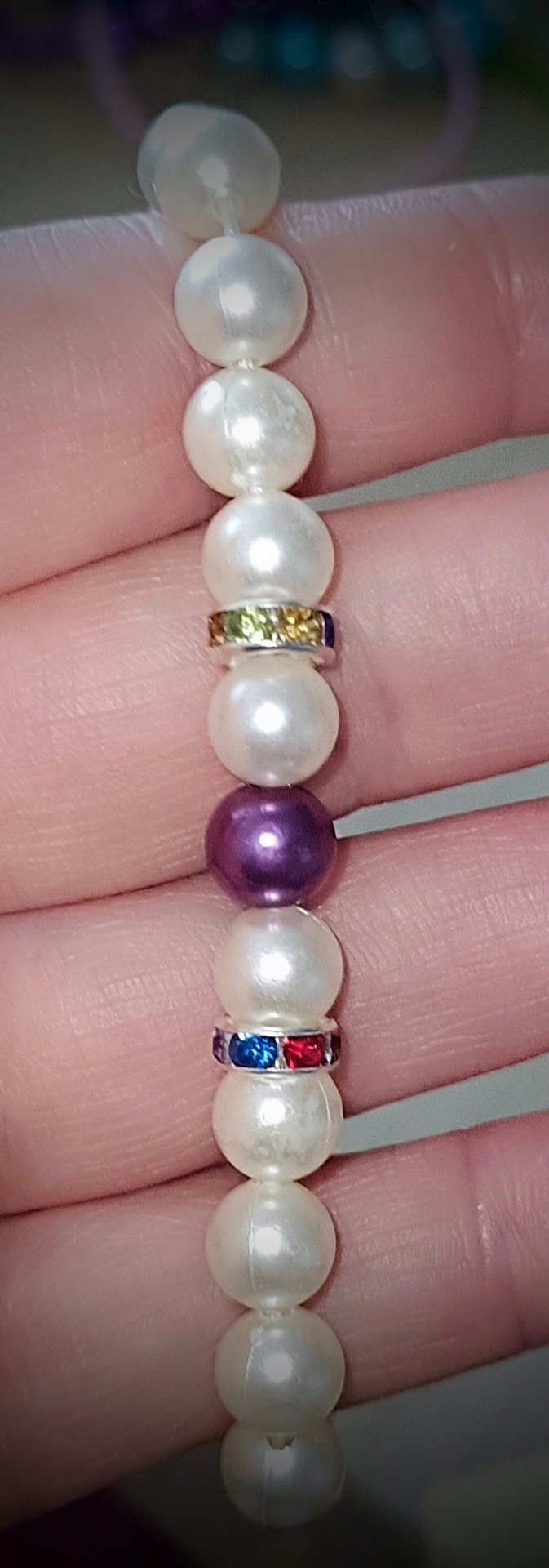 Elegantní náramek z jemných perliček doplněný dvěma třpytivými rondelkami a výraznou fialovou perlou uprostřed .