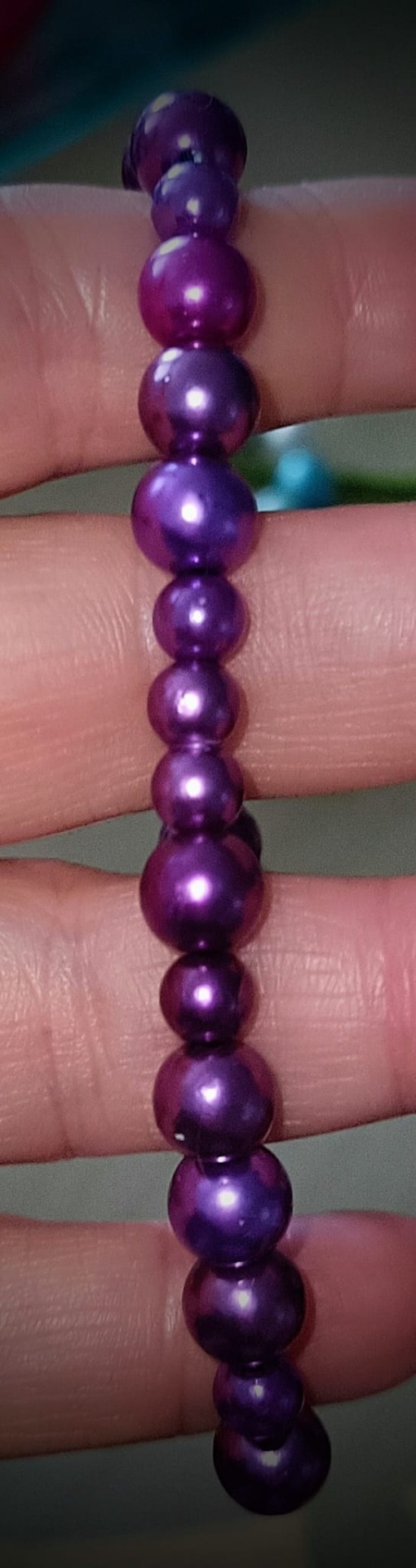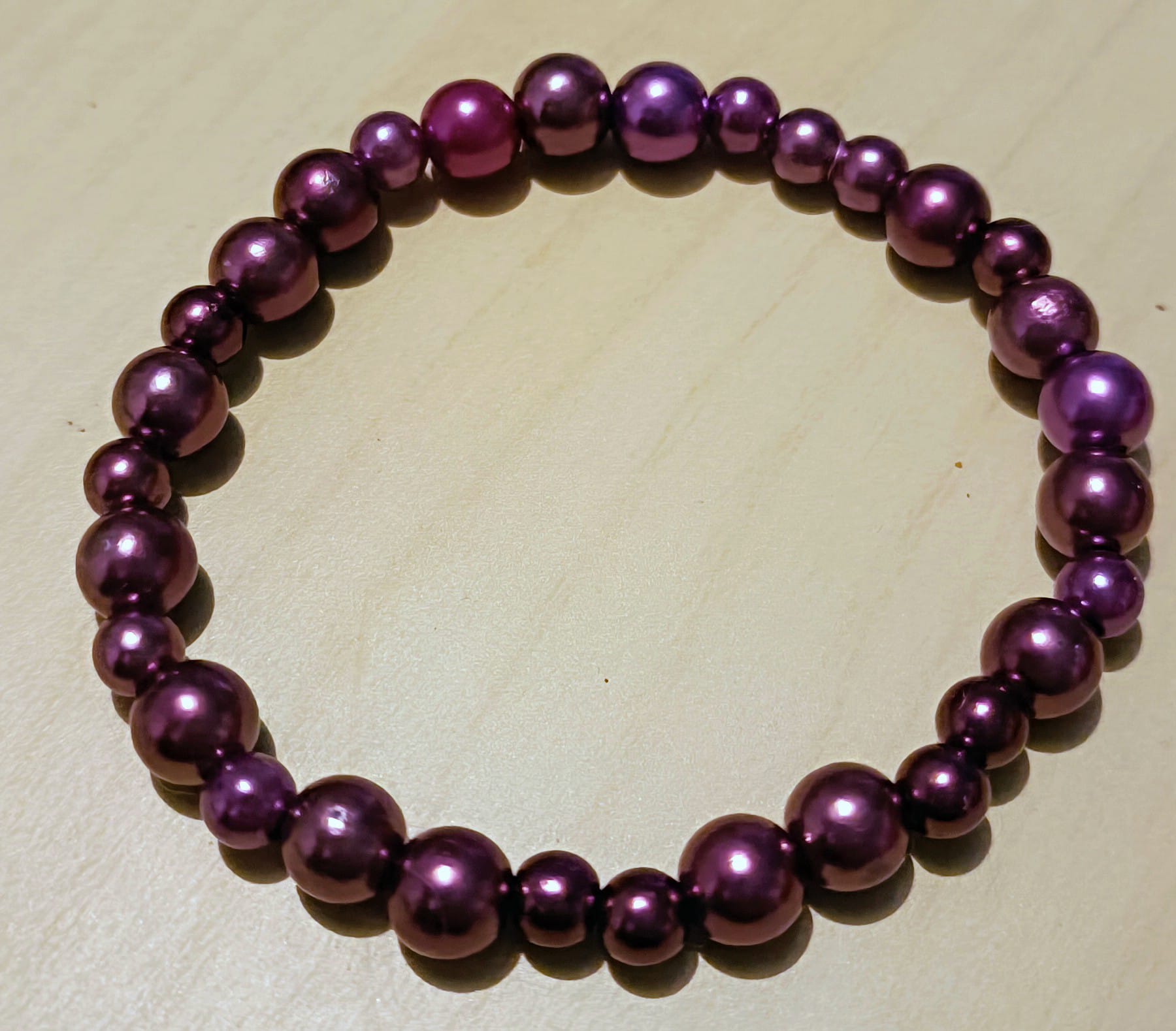 Elegantní fialový perličkový náramek vytvořený z lesklých korálků v různých velikostech .